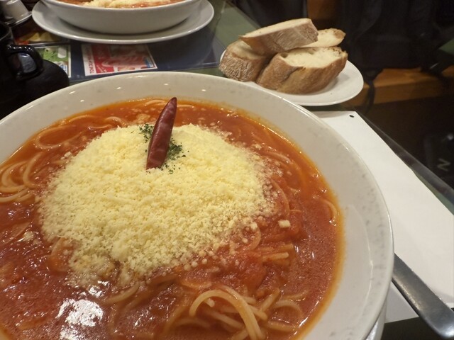 赤唐辛子とにんにくのトマトソース(乾麺・普通サイズ税込1128円)にランチセット(税込330円)をチョイス。風味豊かな赤唐辛子のトマトソースにニンニクのパンチが効いたガツンと美味しいパスタ。セットのパンに余ったソースをつけても絶品でした