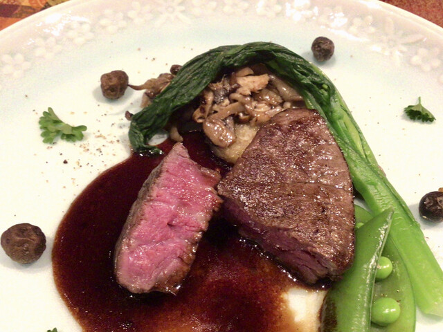 宮崎産牛の赤身とジューシーなフォアグラに、マデラワインソースが合う~っ。