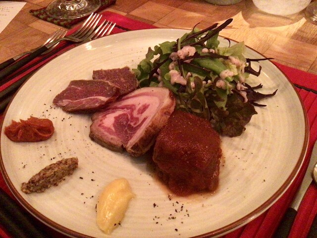 左手から、鴨もも肉のコンフィ・自家製ベーコン・自家製ソーセージ。