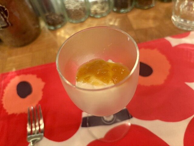 牛乳と生クリームをゼラチンで固めました。ソースは金柑のソース。