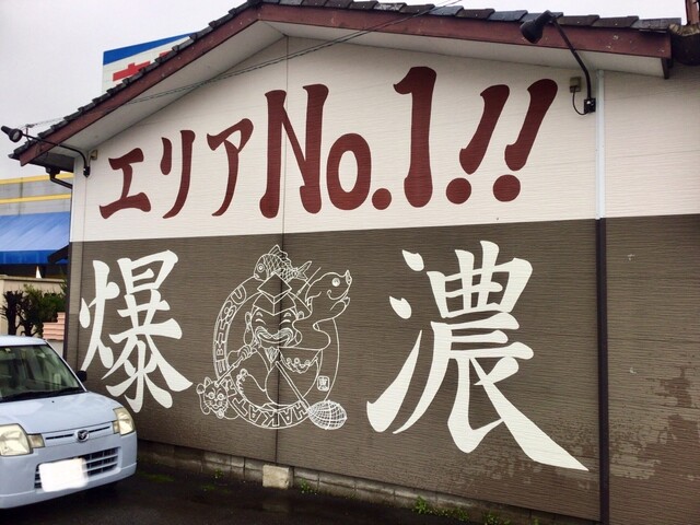 「エリア№1!! 爆濃」と店舗側面にペンキ書きで謳うラーメン店。