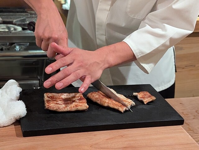 小川原湖の天然の鰻。生の鰻の皮目を香ばしく焼き入れて。下には炊き上がったお米を酢と合わせて温かい酢飯のようなものを敷いて。甘く炒めた長葱と(骨からとった)詰めを舎利の方に少し垂らして。山葵を添えて。