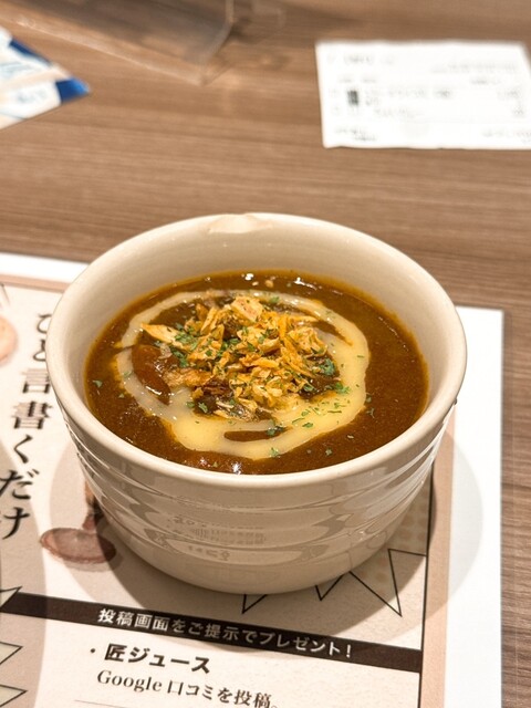 「ちょいカレー」は、まさに“ちょっと食べたい”ときにぴったりのミニサイズ。スパイス感がほどよく効いたルーに、フライドオニオンとクリーミーなソースが加わって奥行きのある味わい。濃厚ながらも後味は軽く、ステーキとの相性も抜群でした。