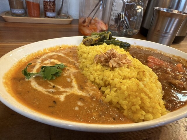 『今日の日替わりカレーは、、、』と妻と会話してると、『今日はスパイシーチキンカリーです。少し辛いです!』と説明していただき、ランチダブルカリーの日替わりチキンカリー×ネイコーリーカリー(バターチキンカレー)にしました。