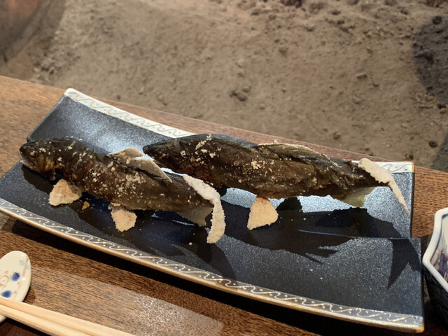 鮎の一品目は先程から囲炉裏に刺さっている天然鮎塩焼き、長良川郡上の鮎で、皿に2尾ずつ泳いでいるような盛り付けで供されました。この季節の鮎は友釣りなので元気が良い鮎とのこと、頭からいただきますが、歯が固くて鋭いので苦手な方は残してくださいとのインストラクションをいただきました。身はピチピチに詰まっていて、確かに武闘派の鮎ですね(^ ^) 鮎の二品目は一夜干し、鮎の身の甘味が凝縮されていて、これは美味しい‼︎