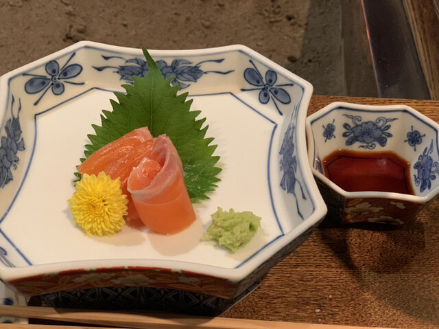 次のお造りはホウライマスという虹崎の突然変異が定着した無班のマスです。養殖ものだそうですが、きれいなサーモンピンクのねっとりした舌触りとキメの細かい身は脂が甘く上質なマスの刺身でした。