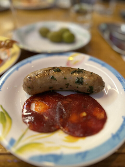 ワインはロゼのスパークリングに変更、料理はエビ焼きと自家製サルシッチャです。マダガスカル産のエビを頭と尻尾を取ってガーリックオイルでソテー、頭と尾はカリカリに素揚げして煎餅のように楽しみます。サルシッチャは皮はパリッと中はハーブの香りと肉汁がほと走るソーセージの醍醐味を味わえます。添えてあるサラミも激ウマ‼︎