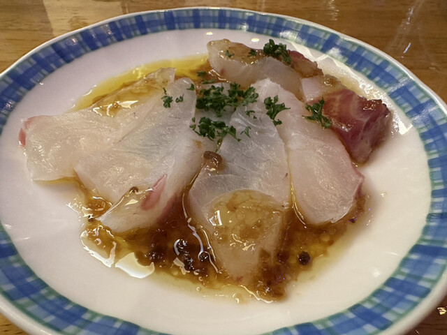 もう1本白ワインで真鯛のカルパッチョをいただきました。カルパッチョはまさかの身厚なカットで5切れもあります‼︎ どこぞのランチの刺身定食のメインよりも食べ応えのある真鯛はしっかり熟成されて旨味凝縮、作るときには手を氷で冷やしながら0〜3度の温度で作るシェフ渾身の一品でした。