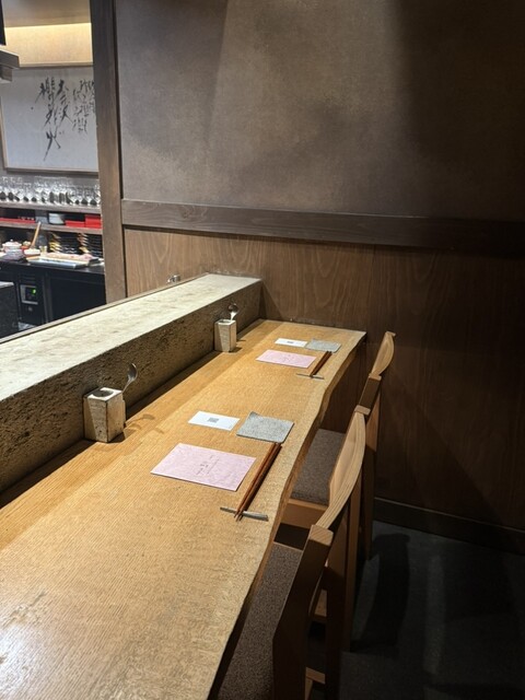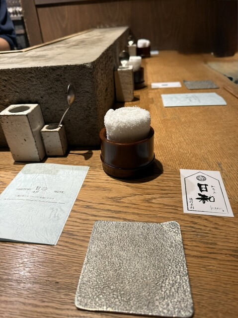 2階にあるカウンター11席の小さなお店の中は、古民家風で全体的に控えめな照明の中、テーブルとキッチンには温かみのある光が溢れていて期待度が上がります。メニューはワインペアリング付きお任せコース 14000円、今宵のテーマは「note(香り)」、前半は日本、後半は世界の香りを巡る仕立てです。