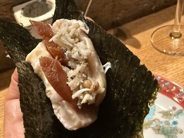 次は海、まずは手巻きスタイルでカラスミと海老を山形のシャモのササミで挟んだ焼き物、文字からは味を想像できないのですが、一口食べれば磯の香、塩味、谷中生姜の爽やかさ、素材の旨みが渾然一体となった海の世界に招かれるのです。もう一つはぶどうの枝木で燻製されたセセリ串のつぶ貝の銀餡かけ、セセリ串がほのかな薫香とつぶ貝とアオサ海苔の旨みたっぷりの餡で包まれ、合わせた白ワインともピッタリです。