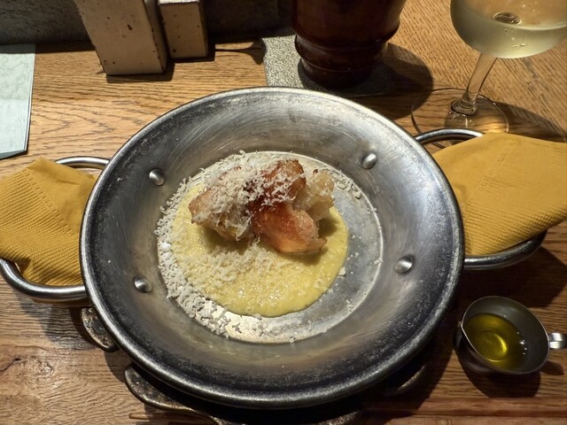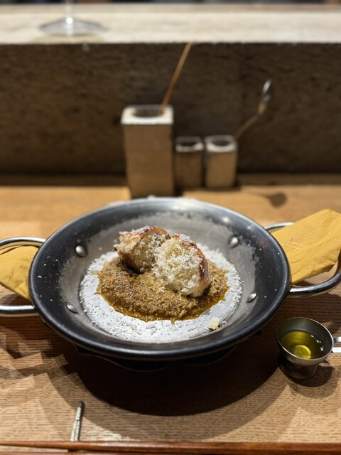 次は地中海に足を伸ばします。手羽飯は手羽先の中にとうもろこしご飯を詰めて備長炭で焼き上げたもの、手羽先餃子の中身がとうもろこしご飯になった、というイメージです。濃厚なとうもろこしソースが敷かれ、手羽先にはパルミジャーノがかかり、スペインのオリーブオイルをかけるのです。この組み合わせとプレゼンにはしてやられました‼︎