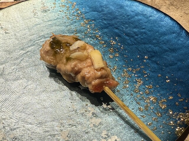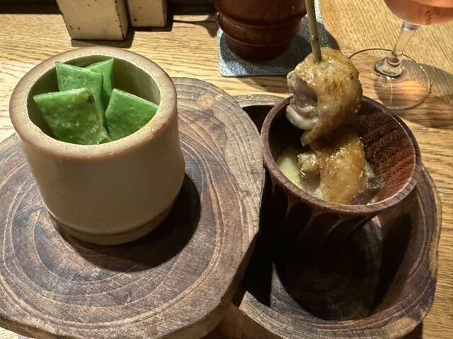 旅はアフリカへ続きます。さえずり串をチョウチンとピーナツベースのマフェソースで口内MIX、コクのあるソースと香ばしく焼かれたさえずりのコリコリ感が合体して最高の一品、そして鴨のつくねは茄子とトマトのソースと共にしっかりした肉感を楽しみます。