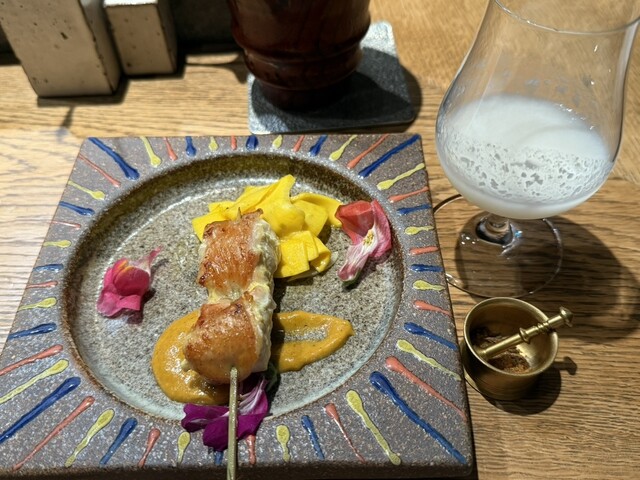 ここから世界の旅に出ます。最初はオリエンタル、どちらかというと中近東系のイメージです。胸肉を首の皮で巻いた「抱き身」串をマカニソースをつけていただくのです。ガラムマサラ、クミン、キャラウェイをすり潰してまぶして食べれば、エキゾチックな世界にひとっ飛び、コリンキーと玉ねぎのアチャールが良い箸休めになります。そしてこれに合わせたお酒は、なんとどぶろく⁈予想外のお酒がエスニックによく合うのにはびっくりでした。