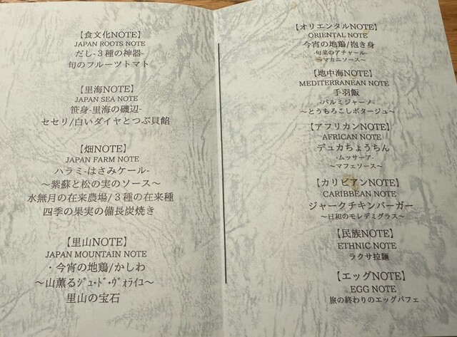 予約したのは全員ペアリングコースで、私は 〜鶏が旅する【NOTE/香調】の世界〜(ミックスペアリング) 15000円、日本酒とワインをそれぞれ料理に合わせてのペアリングです。お品書きは以下となります。