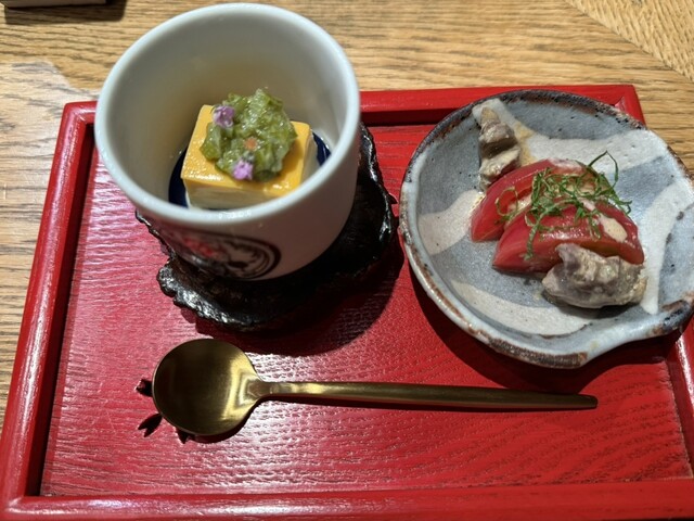 そして最初は日本の伝統の出汁の世界です。利尻昆布、ドンコ、枕崎の鰹節の3種の出汁のたまご豆腐、そしてフルーツトマトと砂肝を黒酢とねり胡麻で和えたもの、和だけど和でもない独特の世界観の一皿です。