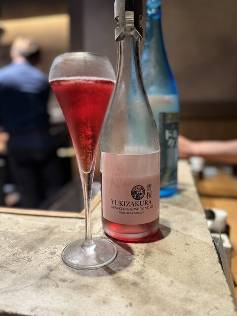 ワインはスペインのアルバリーニョ、僅かな塩味とミネラル香が海の幸にピッタリです。磯辺は実山椒、シラス、自家製カラスミをササミで挟み、海苔の磯の香り、カラスミの濃厚な旨み、ジューシーなササミが渾然一体、食べたことのない組み合わせですがこれを合わせるシェフの感性に脱帽です。パルフェはイワナガマス、バルサミコで漬けた砂肝とホタテをロゼワイン「雪桜」と出汁のジュレを合わせた冷製、微かな薫香も感じる複雑な風味は一期一会となる絶品でした。