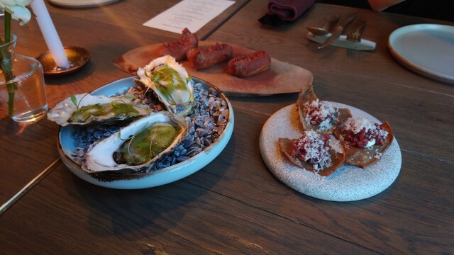 オイスターのガスパチョ。若干スモークを効かせ、ガスパチョがタバスコでアクセントをつけて、旨し!