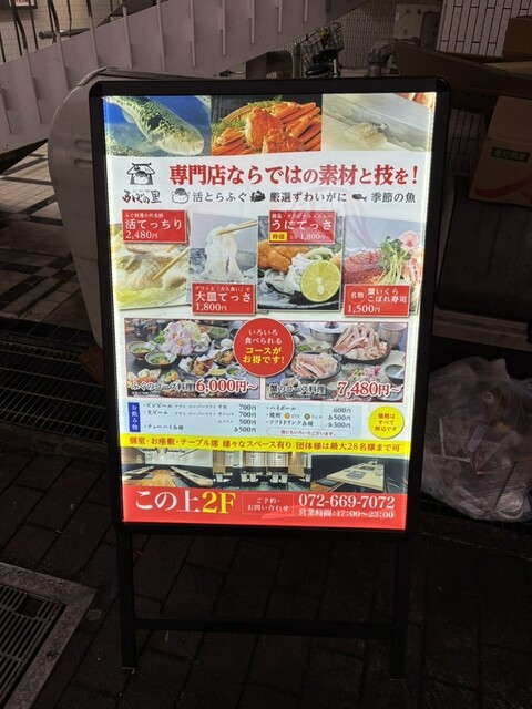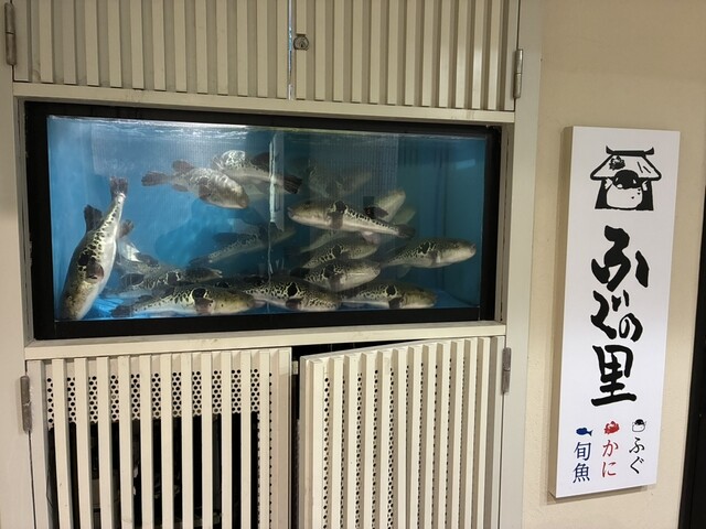 阪急高槻駅から歩いて3分くらいの場所にあるお店で、入口にフグの泳ぐ水槽があって、元気に泳いでいました。