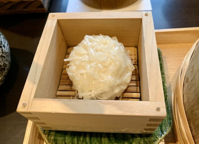 桶盛りには焼き魚や出汁巻き玉子、琥珀餡かけの湯葉など、地元の素材を活かした料理が並びます。