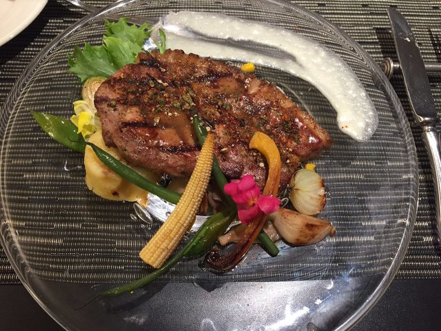 選べるメインの淡路島産豚肉のグリルは驚く程の厚さだが、柔らかくナイフで楽にカットできる。