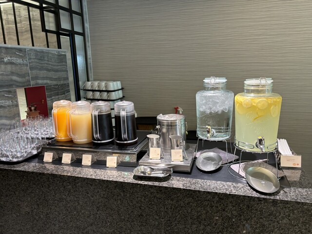 ドリンクはコーヒー紅茶(I&H)、ジュースが3種程、カフェマシーンでカフェラテ等各種(スタッフさんに頼めば入れてもらえる)用意されており十分。