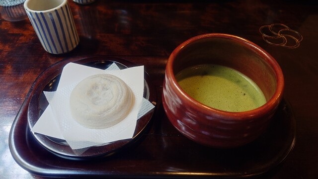 昼前だったこともあり、週末でしたが、並ばず入店できました。梅が枝餅付きの抹茶セットを注文。梅の模様が刻印されたシンプルながらもほっこりとする餡入り焼き餅です。抹茶は冷茶、温茶が選べます。店内は町家造りで落ち着いた雰囲気のお店です。ご馳走さまでした。