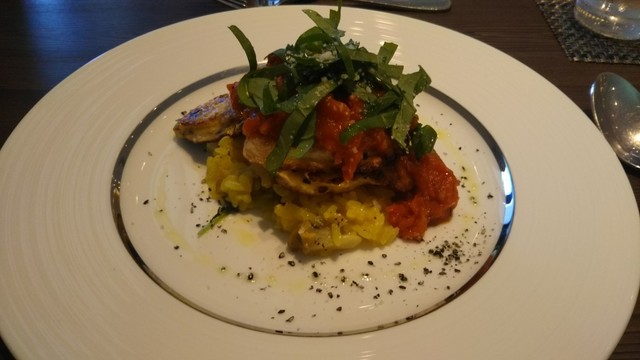 メインは、豚ホホ肉のカツレツ、白身魚のピリ辛トマトソースリゾットです。