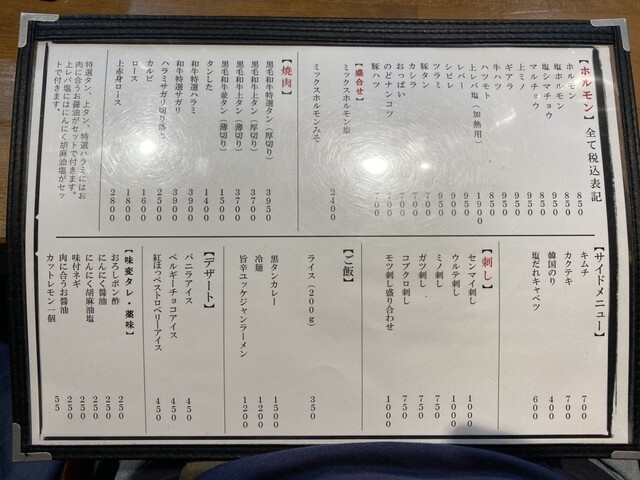 入ったら同じ時間帯で一番最後に入店。だから注文するのも最後だった。早めに入っていれば頼めたものもあったかもしれない。特選タン、上レバー、ギァラは売り切れ。他にもパラパラと。でも特選ハラミ、上タン、レバー、マルチョウ、せんまい刺し、ハラミサガリ切り落としなど注文。平日のほうが新鮮なお肉が食べられると説明見ていたが土曜でも美味しくいただけました。次は特選タン、上レバー、サガリも食べたし。