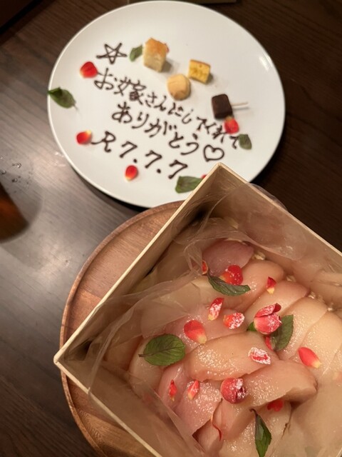 さらに驚いたのは、お店のご厚意で桃のケーキも頂いたこと。ホスピタリティのある温かい接客をしていただき、思い出に残る素敵なディナーになりました。