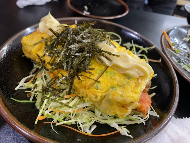 明太玉子焼きがこれまた絶品!熱々の玉子の中に明太子がたっぷり入り、マヨや刻み海苔との相性も抜群。