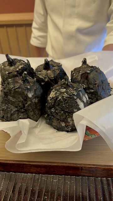 中抜きの堀川牛蒡、雪まろげの中の河豚、カラスミ餅に伊勢海老。