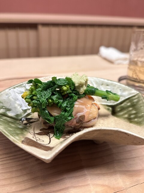 密に締まった赤貝は滑りからコリコリとした抜群の食感を生み、噛んでも噛んでも味と香りが滲み、添えられた菜の花の青苦が味を引き立てる。