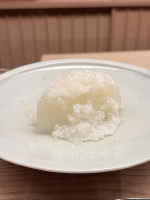 名残雪に見立てた米は甘味と塩味を帯び、大根と口の中で重奏して膨よかな味わいを形作っていく。