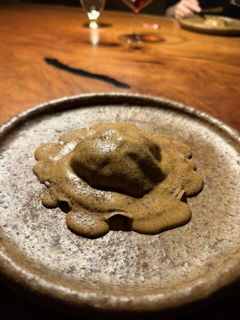 口に入れた瞬間に、発酵ポルチーニの香り、猪の美しく力強い旨味、どんぐりの柔らかなえぐみとソースのコクが、発酵感の出す酸味で押し上げられ一気にピークに!