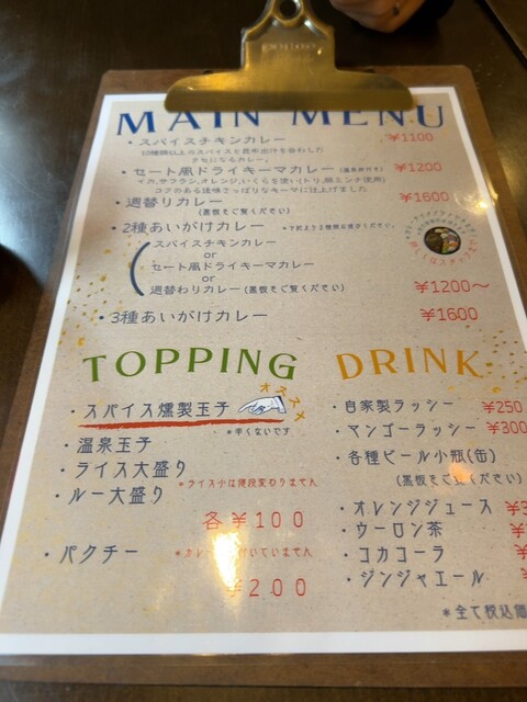 ⭐︎週替わりとチキンカレーのあいがけと燻製たまご。マンゴーラッシーも。