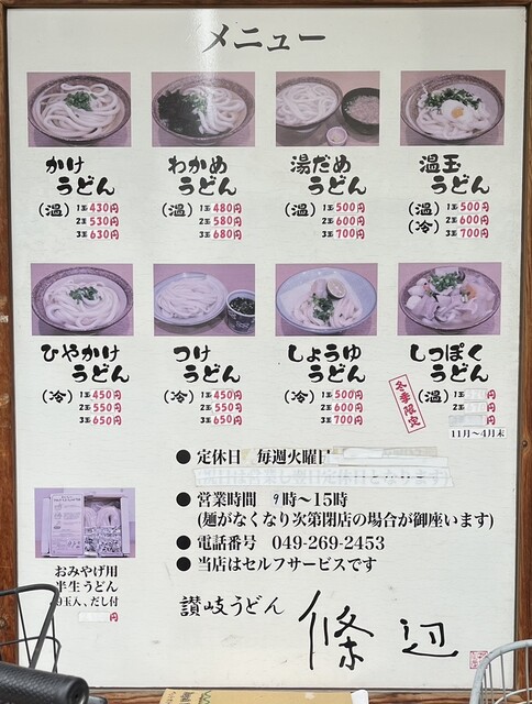 ひやかけうどん450円、しょうゆうどん500円、ごぼうとなす天