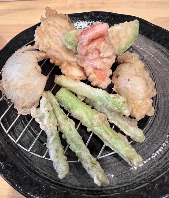 天ぷらは海老に牡蠣、アスパラガスや椎茸など、