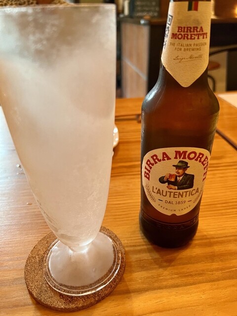 モレッティにスイッチして豚バラ肉とキノコの醤油バター。