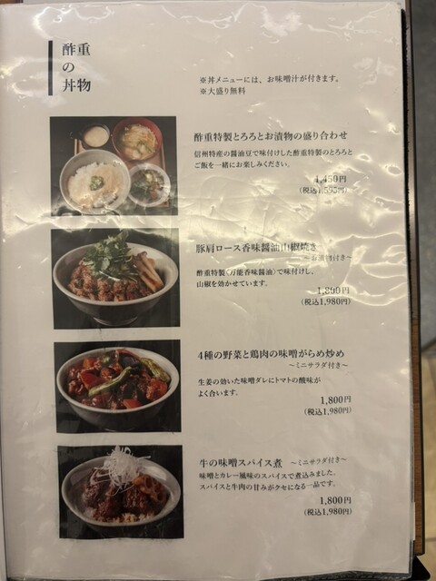 酢重特製の万能香味醤油がめちゃくちゃ美味しい…!!!深みがあり香ばしく山椒も効いていて、このタレだけでご飯が進む進む。ロースは柔らかく、ネギはトロっとしてちょうどいい焼き具合。三つ葉もよく合う!ご飯と味噌汁がおかわり自由なのが嬉しすぎる。この味噌汁もえのきや油揚げなど具沢山でほっこり優しい味で大好き◎
