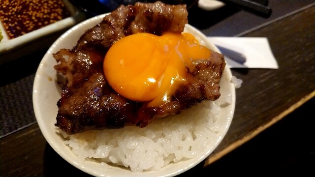 こちら炊きたてご飯をついで、その上に焼いたお肉と卵を乗っけて丼風に。