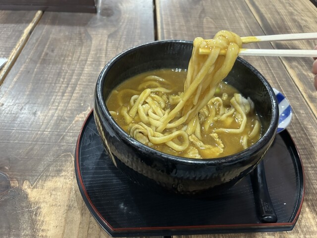 平日のお昼に伺いました。カレーうどんの五合もりをいただきました。キッチペーパーを前掛けがわりに持って来てくれました。麺は冷やもりの時より柔らかいです。具は豚肉と長ネギです。汁は粘度高めで熱々で、ツルツルとはすすりづらいです。出汁が効いていてそんなに辛くは無いです。食べているうちにポカポカになりました。