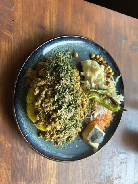 日曜日のランチに妻と伺いました。道路から曲がる場所が分かりづらいですね。駐車場から坂を登ってお店に入ります。空調の効きが若干悪くて少し暑かったです。私がドライココナッツキーマを妻がスパイス増しトマトミートをいただきました。飲み物は炭酸水をいただきました。色んなスパイスがたくさん複雑に入っていてとても美味しかったです。汗をかきましたが。又こちらにきたら来店したいです。