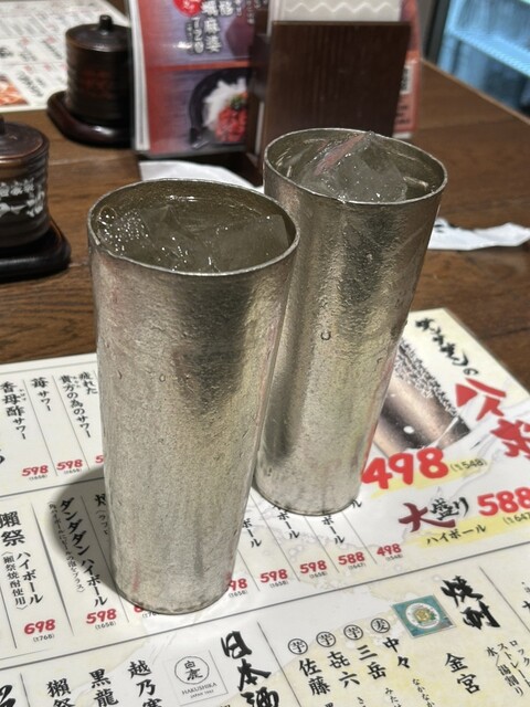 土曜日の夜に2軒目で妻と伺いました。肉汁餃子と麻辣湯肉汁餃子と本日の馬刺しをつまみに獺祭ハイボールを飲みました。肉汁餃子はタレをつけなくても十分味がして美味しかったです。麻辣湯肉汁餃子は適度な辛さでした。馬刺しには塩とニンニクと生姜が薬味で付いてました。獺祭ハイボールは香りと甘さが良かったです。