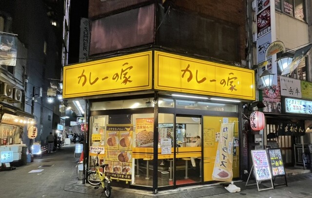 飲み屋が集まっているエリアの角地に黄色いお店。昔ながらのカレースタンド。