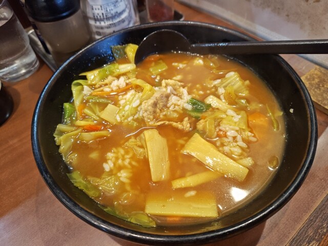 煮込みラーメン=土鍋と誰もが妄想するであろう。しかし、到着すると…。土鍋ではなく、ラーメン丼での提供に。野菜豊富たっぷりのあっさり、トンコツタンメンであった(笑)!!