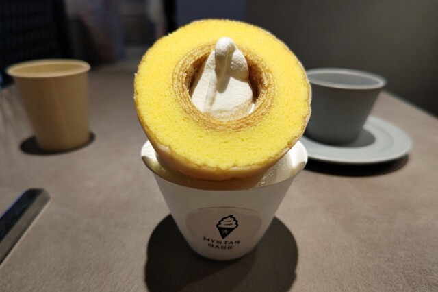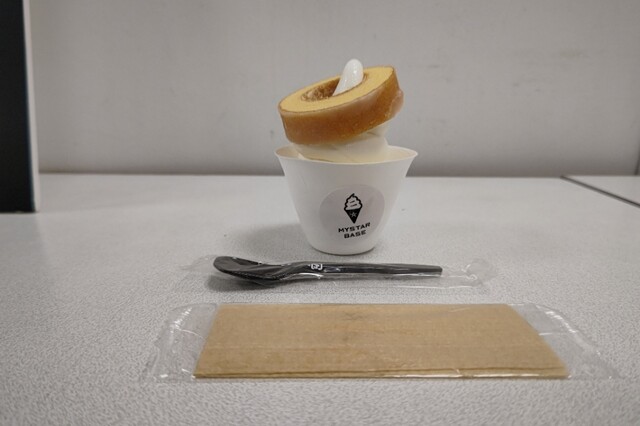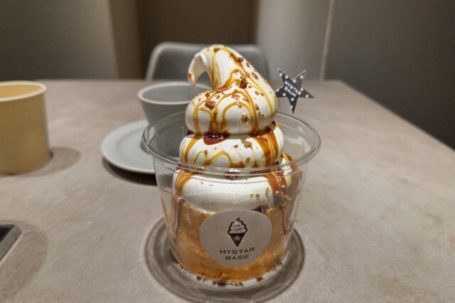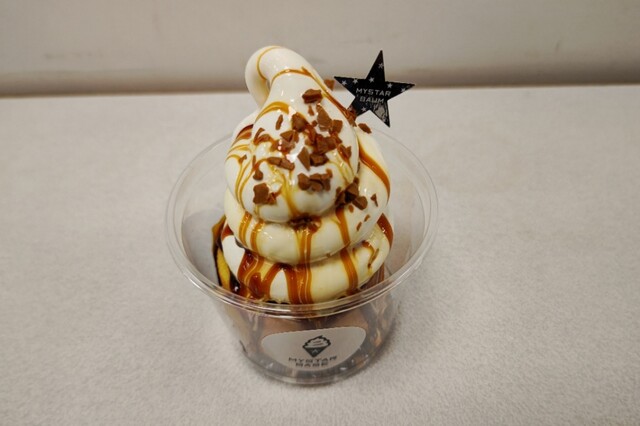 バームクーヘン+ソフトクリーム+カラメルソース+カスタードクリーム+キャラメルフレーク。スイーツ好きの自分には、どれもが大好きな組合せ。食べ逃したら、絶対に損×2(笑)!!