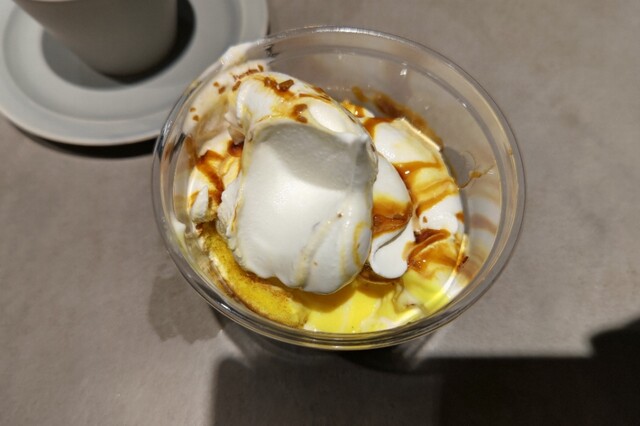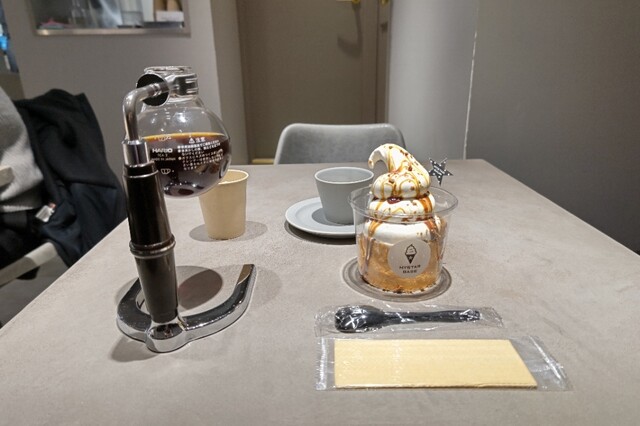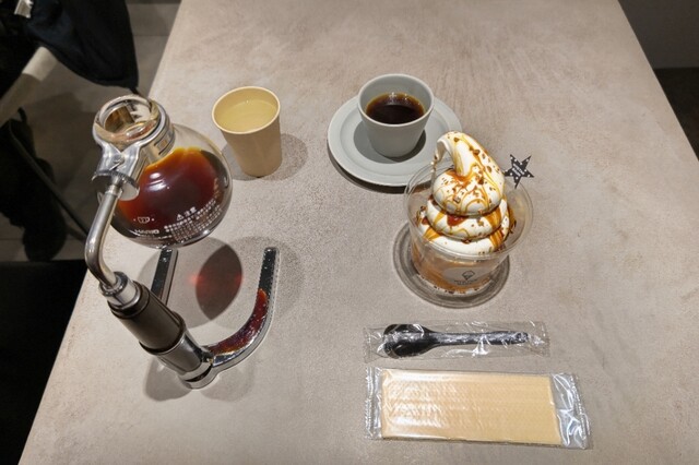 内容は、催事場限定と全く同じ。バームクーヘン+ソフトクリーム+カラメルソース+カスタードクリーム+キャラメルフレーク。スイーツ好きの自分には、どれもが大好きな組合せ。やはり、サイフォンコーヒーは必要不可欠(笑)!!