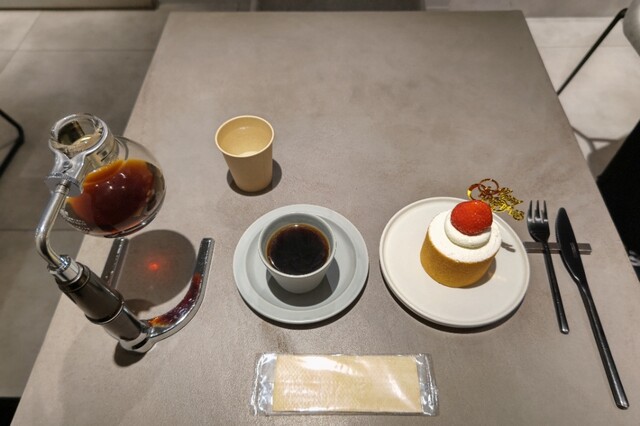今日は、先週Instagramで予約した。シャインマスカットナガノパープルショートケーキ+シャインマスカットショートケーキ。そして、ワンドリンク制なので。定番のサイフォンホットコーヒーをオーダー(笑)!!