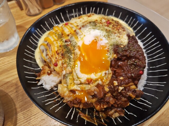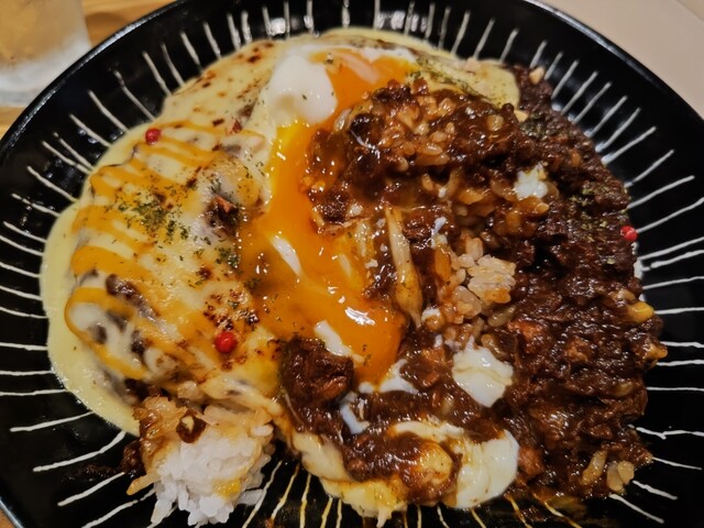 到着すると…。グラタン風に上からチーズと混ぜないドライカレーの半々に。チェダーチーズソースがかかり。センターには、温玉が鎮座(笑)!!