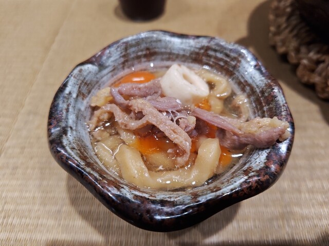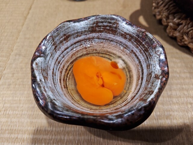 麺だけをそのまま食べ、これだけでも十分に美味しいが。次に、追加した追い卵にタレを入れて、卵を溶いてすき焼き風にして食べる。これまでにない、初の新感覚ラーメン。親鶏も弾力十分(笑)!!